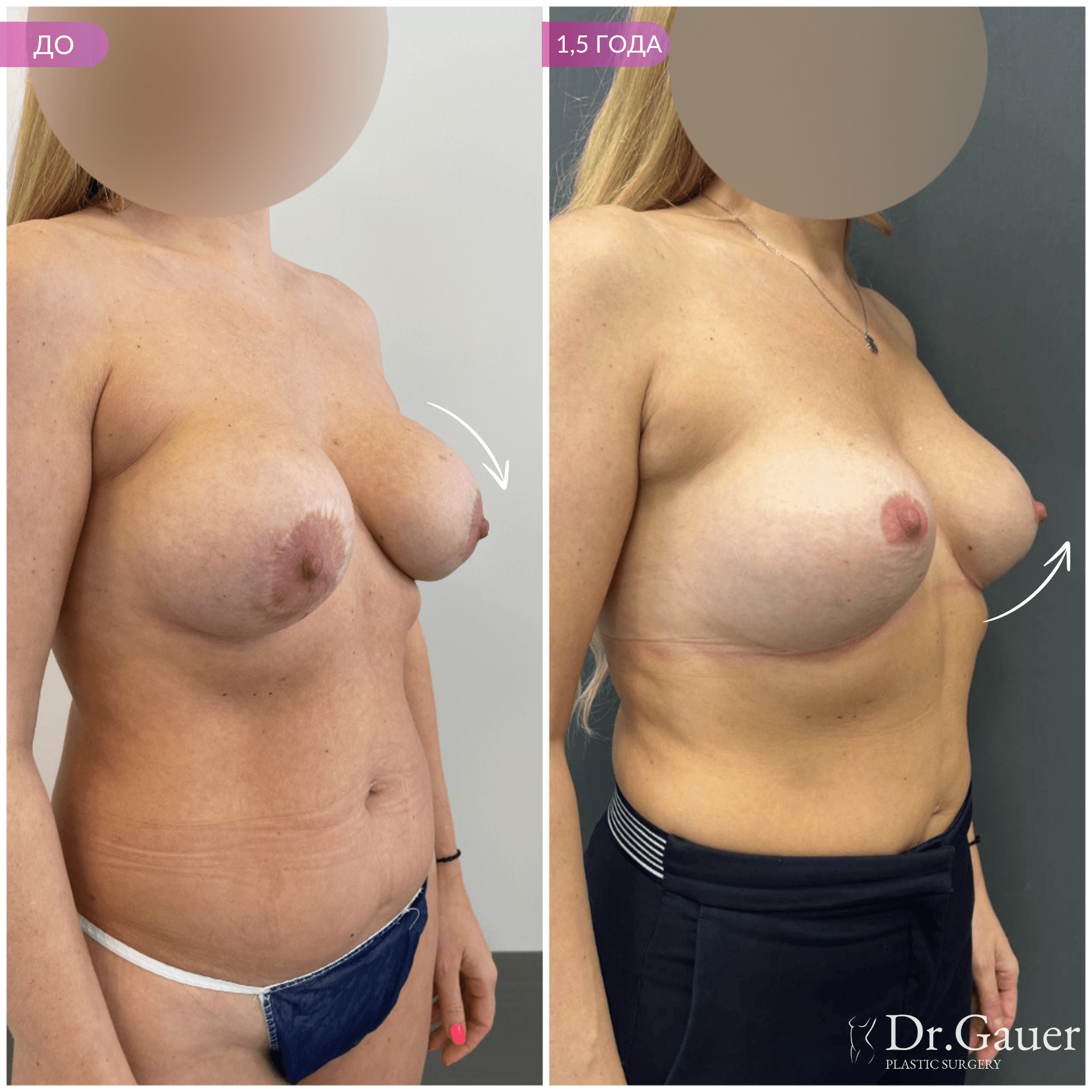 На фото вы видите пациентку спустя 1,5 года после реэндопротезирования молочных желёз с Т-образной подтяжкой. Прекрасный естественный результат, и болезненные ощущения теперь позади!
